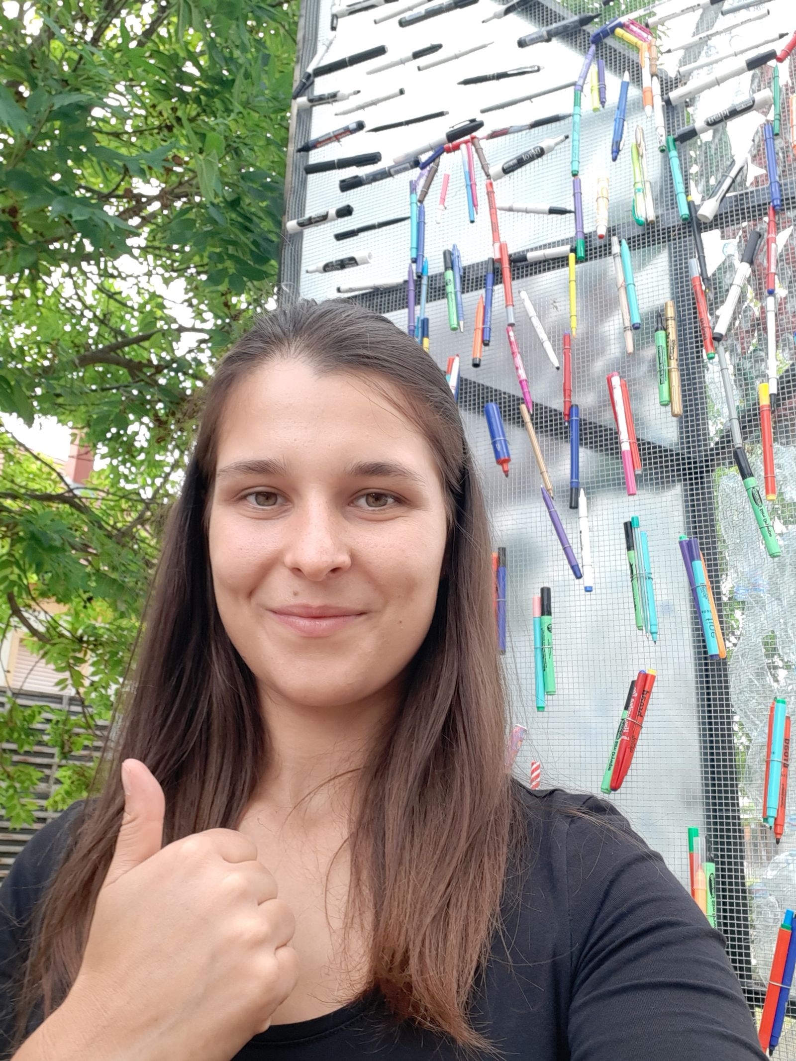 –Mára létrejött egy művészeti irányzat, a trash art, ami kifejezetten a szemetet használja alapanyagként. Egyfelől az alkotás újrahasznosítássá válik, másfelől a szemétből szép és kreatív mű születik, ami képes közvetíteni egy gondolatot – meséli Veronika, aki többször vett részt trash art-pályázatokon. A Hybrid Art pályázata révén például csoportos kiállításon is bemutathatta az amerikai székhelyű TerraCycle budapesti gyűjteményébe beválogatott munkáit. A használt golyóstollból, filctollból végül csak a színes műanyag „burok” marad, de Veronika keze nyomán az íróeszközök műanyaghüvelyéből színes mozaikkép, logó született.