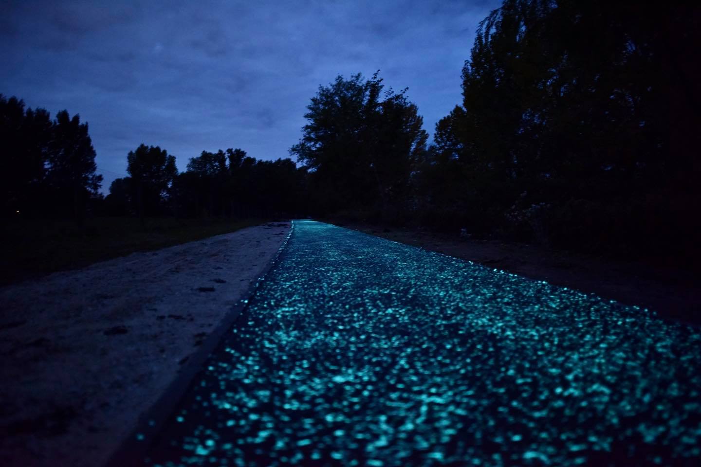Kissé kísérteties, de nagyon vonzó fényben kerekezhet, aki a Dunakanyarban Esztergom felé halad a főváros irányából. Az útpálya szélébe kísérleti jelleggel beépített anyag úgynevezett fotolumineszcens boroszilikát anyagú, gyantába ágyazott szemcse, amelyeket a nap fénye feltölt, majd az így kezelt felület világít a sötétben.