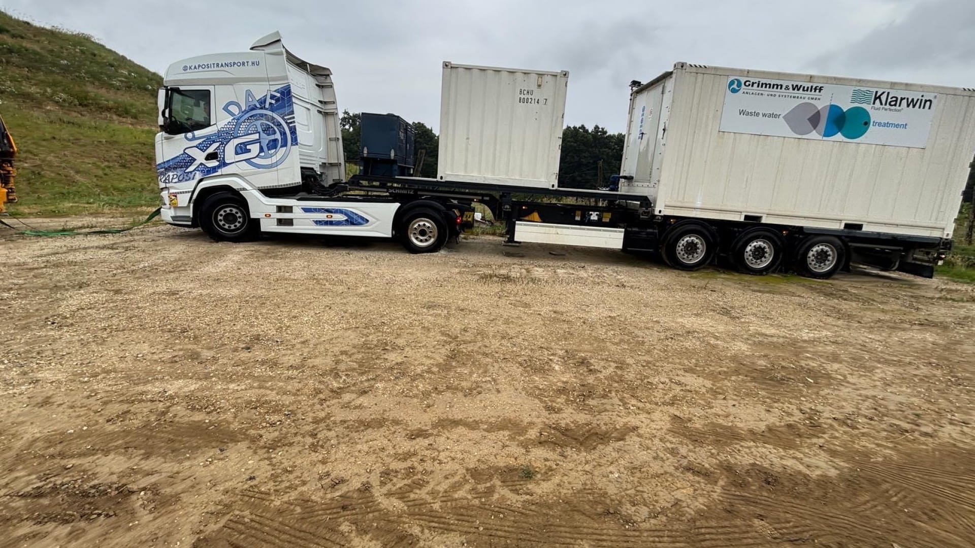 –Van, amikor pótkocsi szállítja el a konténert, így daruzni sem kell, csak egy ún. kamionfej szükséges a művelethez. Az említett esetben pontosan így történt, egy húszlábas konténerbe szerelt technológiát mozgattunk az egyik településről a másikra. Ez a berendezés havi 1200 köbméter csurgalékvíz megtisztítására alkalmas. A kihívás ilyenkor az, hogy a lehető legjobb minőségű pótkocsi kerüljön a konténer alá, ugyanis akár több hónapon át is bírnia kell az igen korrozív csurgalékvíz közeli állapotokat, ellen kell állnia a különböző típusú szennyeződések hatásainak. Kihívás továbbá a folyamatos terhelés toleranciája is, hiszen még a kisebbik berendezésünk esetében is 10-12 tonnás súlyról beszélünk és akkor vizet még nem is szivattyúztunk bele. Két munkatársunkkal egyébként leszereléstől számítva a másik helyszínen beüzemelve egy hét alatt el tudjuk indítani a működtetést.
