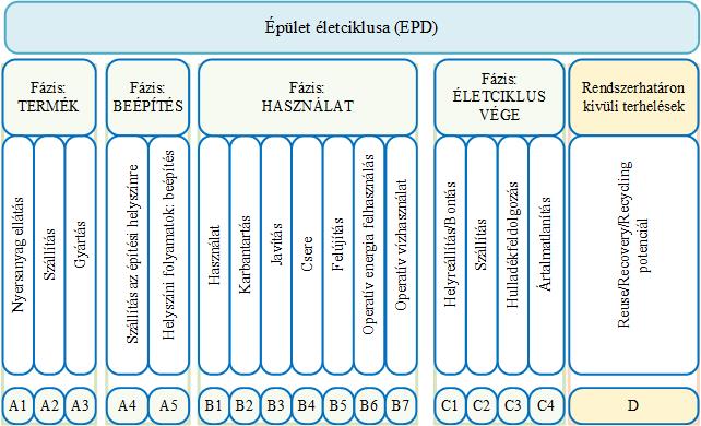 Egy épület életciklus-értékelése nemcsak a szükséges információkat tartalmazza, hanem alapvető eleme az épület fenntarthatósági tanúsításának. Az életciklus-szemlélet az üzleti életben, a szakemberek körében ugyan már elterjedtebb, de az építkezésbe kezdő utca embere korlátozott információkkal rendelkezik épületeink környezeti hatásairól. A környezetvédelmi terméknyilatkozatok (Environmental Product Declaration, EPD) mindazokat az alapvető adatokat tartalmazzák, amelyek lehetővé teszik az épületek környezeti értékelését. Az épületek esetében elvégzett karbonlábnyom számítása teljeskörű választ ad egy épület környezetterhelésére, ahol az épület CO2-emisszióját az egyes EPD szakaszokra célszerű meghatároznunk. Minden egyes épület egyedi elemzést igényel a környezeti hatások optimalizálási lehetőségeinek azonosítása érdekében. Egy épület teljes életciklusának EPD moduljait az 1. ábra szemlélteti, amelynek szakaszai: