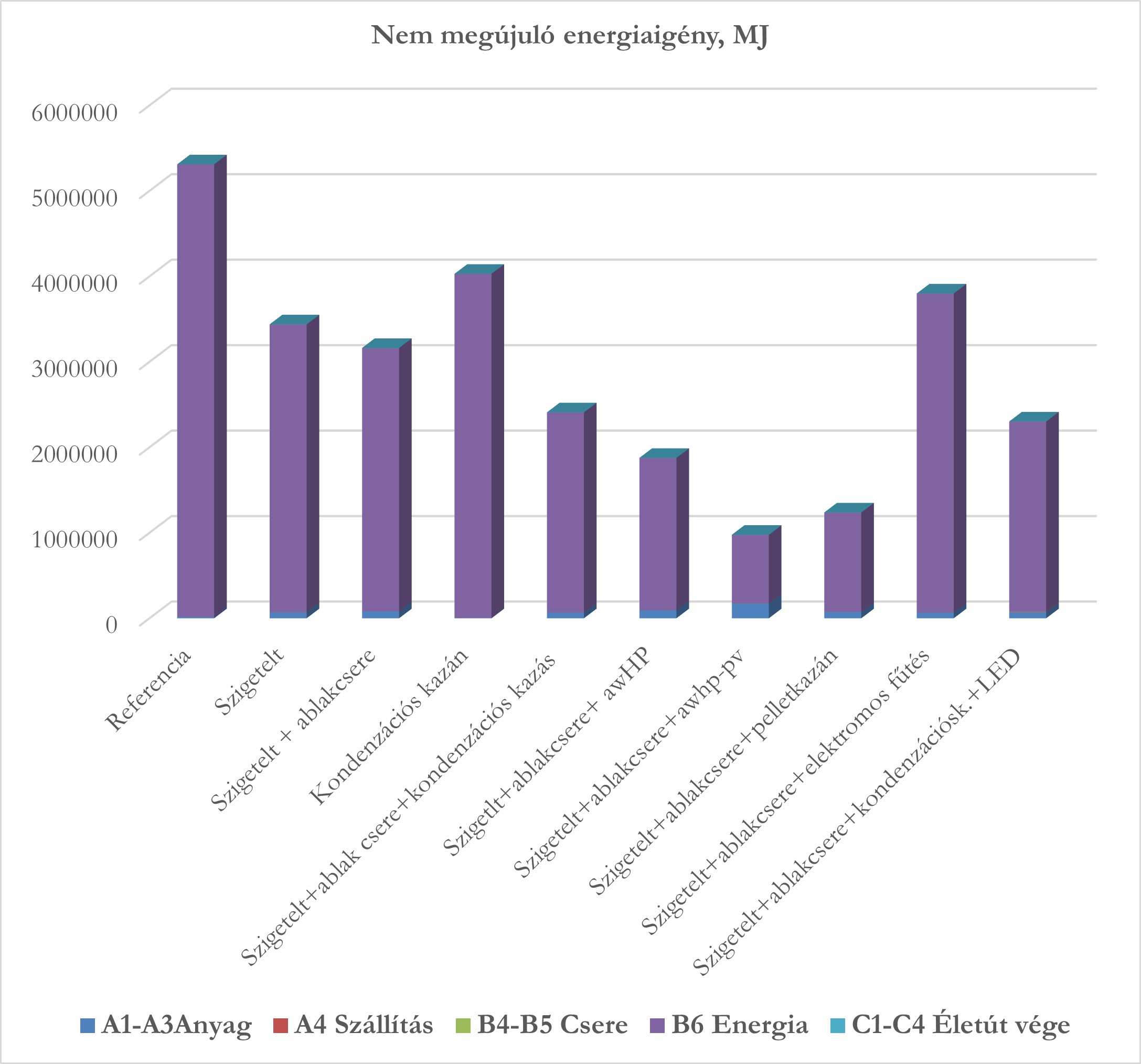 Az épület-felújítások különböző eseteit figyelembe véve jelentősen csökkenthető a CO2-kibocsátás, amit a 2. ábra szemléltet. Ha ehhez az életciklus-költségeket is figyelembe vesszük, megállapítható az, hogy a környezetterhelés csökkentése valamennyi esetben költségcsökkenéssel is jár. A legnagyobb üvegházhatású gázkibocsátás-csökkenés falszigetelés, ablakcsere és pellet kazánra vagy napelemre és hőszivattyúra történő átállással érhető el. A nem megújuló energiaigényeket a 3. ábra mutatja.