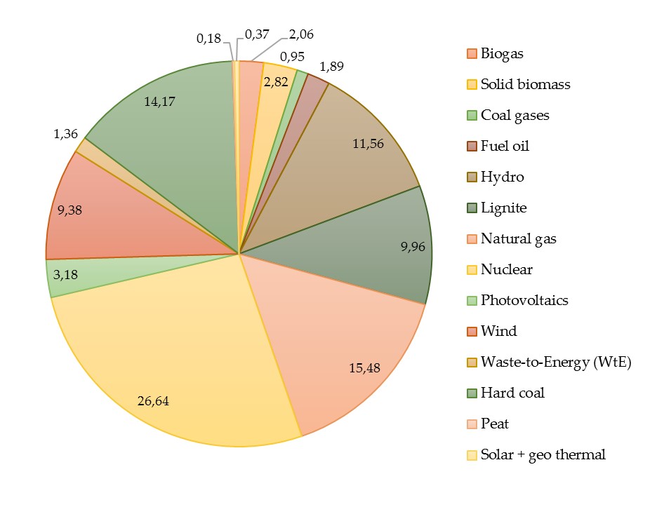 1. ábra: EU energiamix (Forrás: Sphera GaBi adatbázis, referenciaév: 2018).