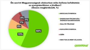 A Greenpeace Magyarország megbízásából a Policy Solutions és az Ipsos készített közös kutatást abból a célból, hogy felmérjék a magyar emberek véleményét arról, hogy Magyarországnak milyen energiaforrásokra kellene alapoznia az energiaellátását. A kutatás eredményei alapján kijelenthető, hogy a magyarok zöld energiát szeretnének az olaj- és gázfüggőség helyett. A Greenpeace emlékeztet rá, hogy hasonló eredményre jutott egy, a Greenpeace által rendelt 2022-ben közzétett közvéleménykutatás is. A magyarok több mint fele (56%) szerint hazánknak elsősorban az olyan megújuló energiaforrásokba kellene befektetnie, mint a szél-, víz-, nap-, geotermikus energia és biomassza. Emellett az ötödük (19%) gondolja úgy, hogy a jövőben leginkább energiahatékonysági és – takarékossági beruházásokra kellene fókuszálni. |